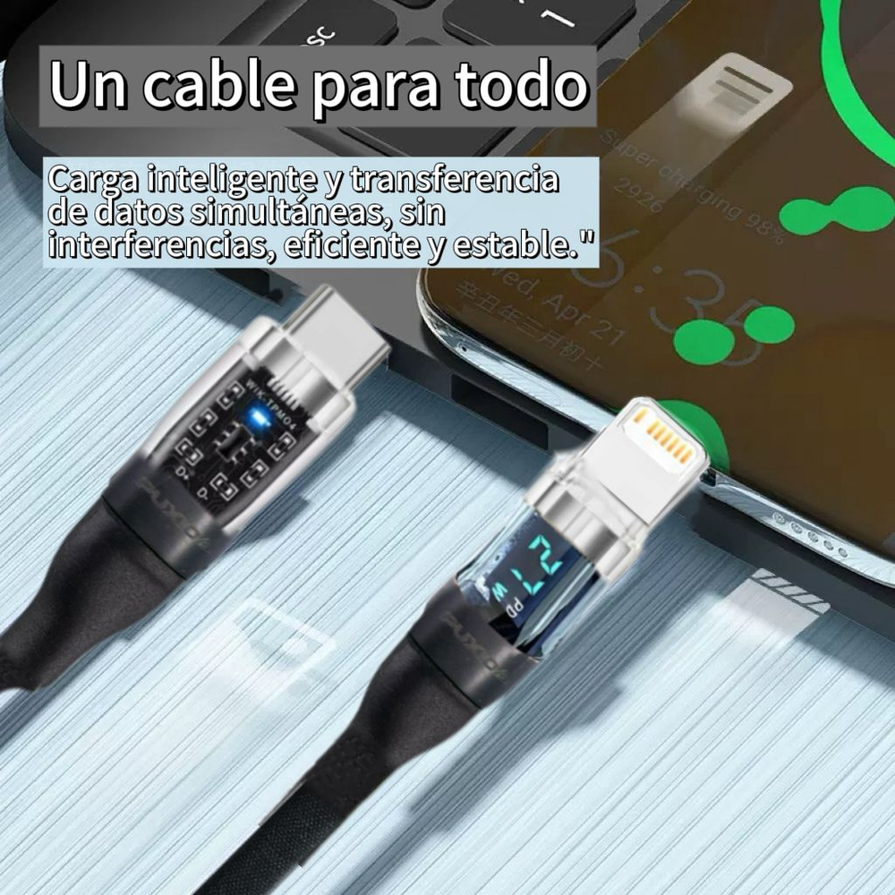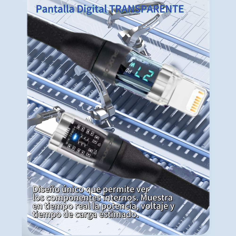 Descubre el primer cable que te permite ver la potencia exacta de carga. Con una pantalla digital integrada, monitoriza el voltaje y amperaje en vivo mientras tus dispositivos se cargan a máxima velocidad. Potencia, transparencia y control total en un diseño revolucionario.