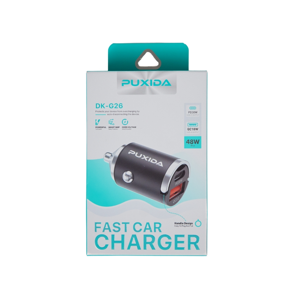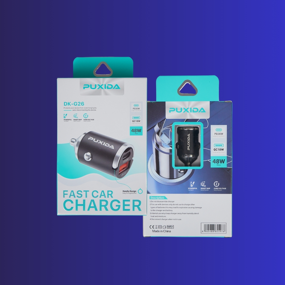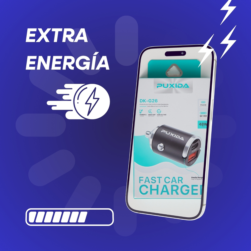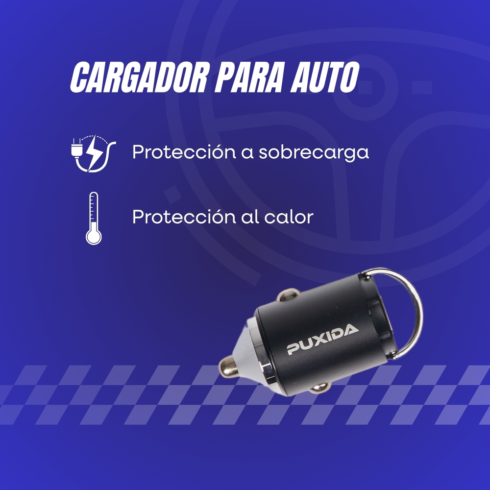 El Cargador para auto de Puxida es la opción ideal para quienes buscan potencia y confiabilidad en cada viaje. Con una salida total de 48W, integra un puerto USB-C con Power Delivery (30W) y un puerto USB con Quick Charge (18W), lo que permite cargar dos dispositivos de manera simultánea con tecnología de carga rápida. Su diseño compacto y elegante se adapta perfectamente al encendedor del auto, mientras que sus sistemas de protección contra sobrecarga, calor y sobretensión mantienen tus equipos siempre seguros. Compatible con smartphones, tablets, GPS y más, este cargador asegura que nunca te falte batería en movimiento, combinando velocidad, seguridad y practicidad.